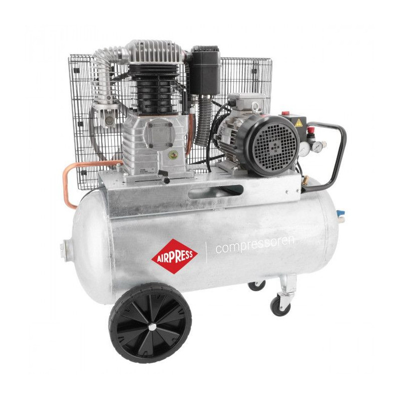 Robuuste compressor met riemaandrijving op een gegalvaniseerde tank, extra beschermd tegen corrosie. Ideaal voor intensief professioneel gebruik met langdurige betrouwbaarheid.