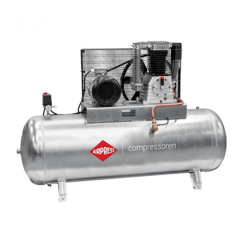 Robuuste compressor met riemaandrijving op een gegalvaniseerde tank, extra beschermd tegen corrosie. Ideaal voor intensief professioneel gebruik met langdurige betrouwbaarheid.