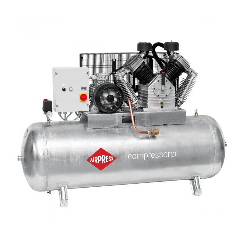 Robuuste compressor met riemaandrijving op een gegalvaniseerde tank, extra beschermd tegen corrosie. Ideaal voor intensief professioneel gebruik met langdurige betrouwbaarheid.
