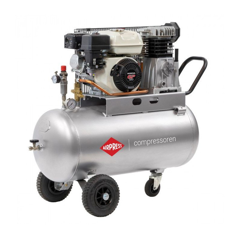 Robuuste, verbrandingsgedreven zuigcompressor op benzine, ideaal voor gebruik op locaties zonder elektriciteit. Krachtig, mobiel en perfect voor intensieve werkzaamheden op de werf.